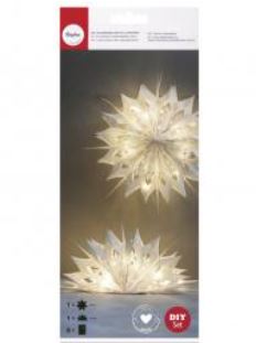 Tästä tunnelmallisesta tarvikepakkauksesta syntyy yksi ripustettava halkaisijaltaan 47cm paperitähti, sekä yksi puolikas, pöydälle asetettava 47cm puolitähti. Lisäksi tarvikkeista syntyy 8kpl erilaisia paperilyhtyjä led-kynttilöitä tai led-valonauhaa varten. Pakkaus sisältää 20 paperipussia, 10m rullan 2-puolista teippiä, helminauhaa, tarraa sekä 8 magneettia. Pakkauksessa on mukana osittain kuvalliset ohjeet, joissa tekstit ovat englannin kielellä. Pakkauksen lisäksi tarvitset sakset, pyykkipoikia tai klipsejä, kuviopihtejä ja/tai -leikkureita, viivottimen ja leikkuualustan, sekä led-valoja ja/tai led-kynttilöitä loppusilauksen luomiseksi. (TE3)