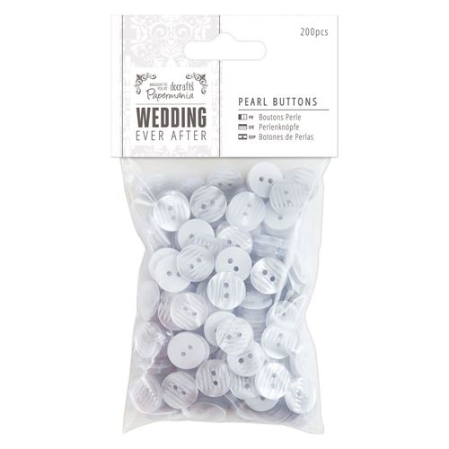 Pakkauksessa on 200kpl helmiäishohtoisia, vaaleanharmaita muovinappeja. (TE1)