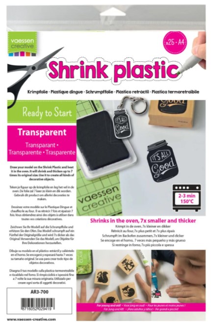 Suurempi pakkaus kirkasta kutistemuovia esimerkiksi päiväkoti- tai koululuokalle. Kutistemuovia voit värjätä vedenkestävillä tusseilla, puuväreillä yms. Muovia kannattaa hioa hiekkapaperilla kevyesti ennen väritystä, jotta väri tarttuu pintaan paremmin. Leikkaa haluamaasi muotoon ja laita 160-asteiseen uuniin kuvapuoli ylöspäin leivinpaperin tai alumiinifolion päälle. Muovi kipristyy ja kutistuu uunin lämmössä noin 50 prosenttiin alkuperäisestä koosta. Samalla värit voimistuvat ja muovi paksuuntuu. Ota muovi uunista pois ja jäähdytä tasaisella alustalla tai litistä painon alla. Huomioi, että liian suuri muovinpala voi kipristyä uunissa siten että reunat tarttuvat toisiinsa ja tuotos menee pilalle - pienemmät kuvat onnistuvat paremmin. Tämä kutistemuovi on kirkas ja väritön. (TE1)