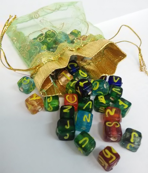 Lasihelmet teemalajitelmana kauniissa pienessä organzapussissa. Helmet on valmistettu käsityönä Intiassa. (TE2)