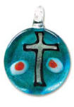 Yksittäispakattu lasiriipus. Ripustuslenkki on niin suuri, että siitä mahtuu samaan sarjaan kuuluva, siemenhelmistä tehty, kolminkertainen kaulanauha.