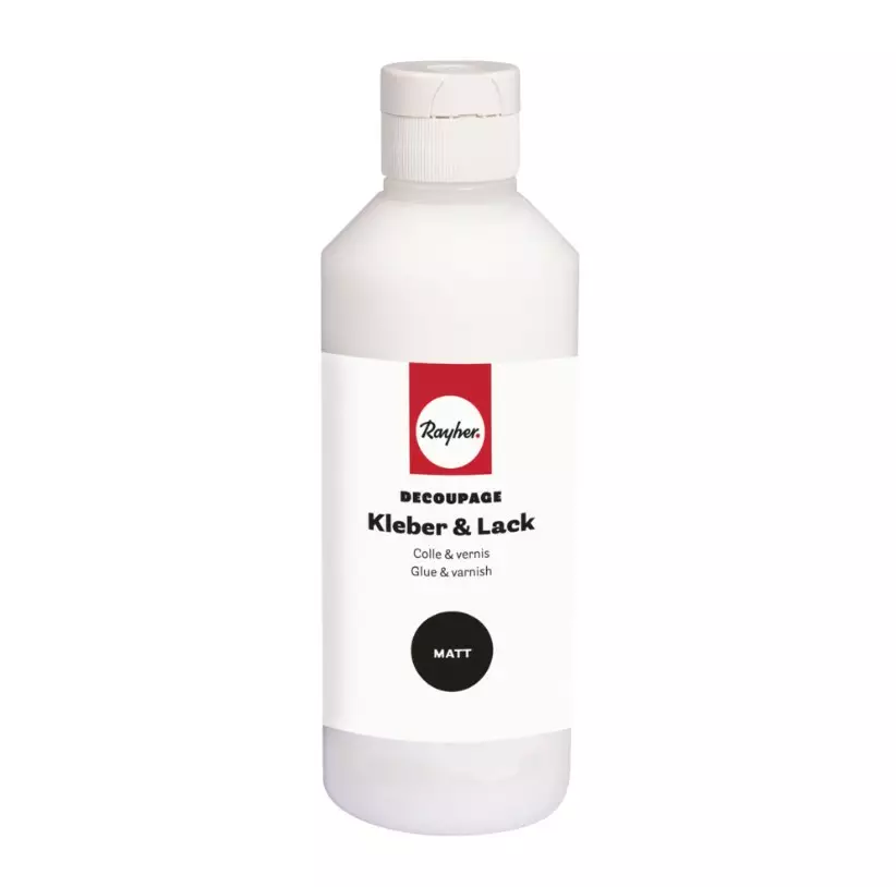 Vesiliukoinen, mattapintainen liimalakka sisäkäyttöön. Soveltuu esimerkiksi decoupage-työskentelyyn eli ns. serviettitekniikkaan. (TE1)