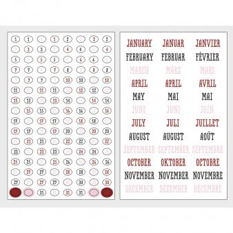 Valkeat kuukausi- ja numerotarrat, joissa tekstit/numerot ovat mustia, punaisia ja vaaleanpunaisia. 1 arkki kuukausitekstejä (ulkomaiset kielet) ja 3 arkkia numeroita. (TE5)