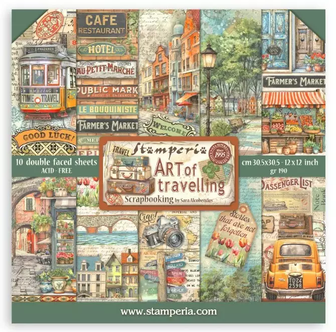 Art of Travelling. Stamperian ihastuttava 10 arkin skräppipaperilajitelma 30x30cm koossa! Paperit ovat kaksipuolisia, 170g vahvuista laadukasta mattapintaista kartonkia. (TE2)