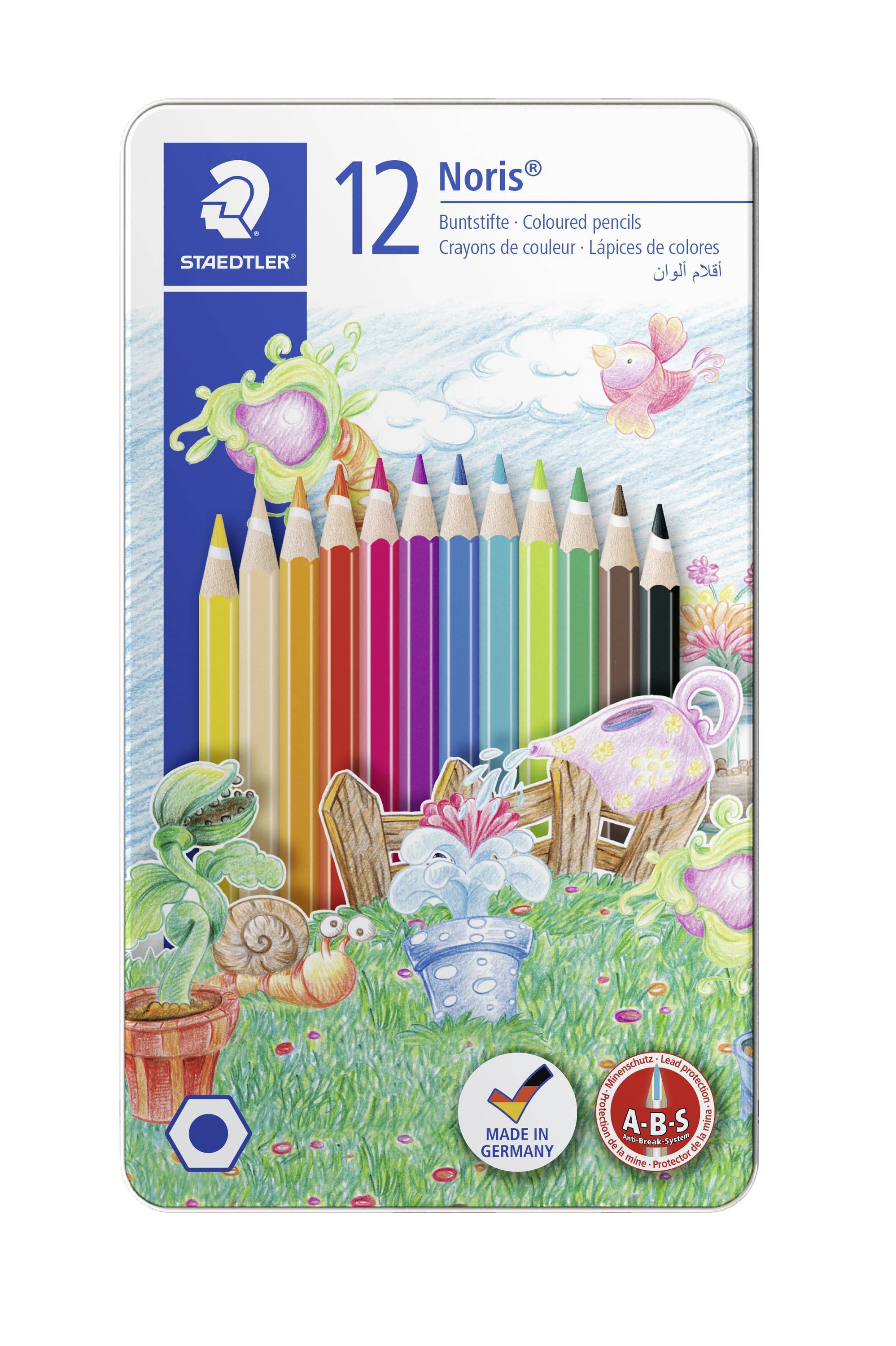 Staedtler Noris - kuusikulmaiset täyspitkät puuvärikynät näppärässä, kolhuilta suojaavassa peltiirasiassa. Täydellinen setti vaikka koululaiselle reppuun! Kynissä on valkoinen A-B-S -vahviste, joka suojaa lyijyä katkeamiselta. (TE2)
