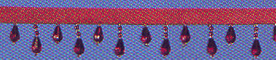 Kanttinauhasta riippuvat muovihelmet. Kanttinauhan korkeus n.1,2 cm. Esim. lampunvarjostimien reunaan tai laukkuihin. (TE6)