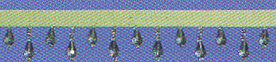 Kanttinauhasta riippuvat muovihelmet. Kanttinauhan korkeus n.1,2 cm. Esim. lampunvarjostimien reunaan tai laukkuihin. (TE6)