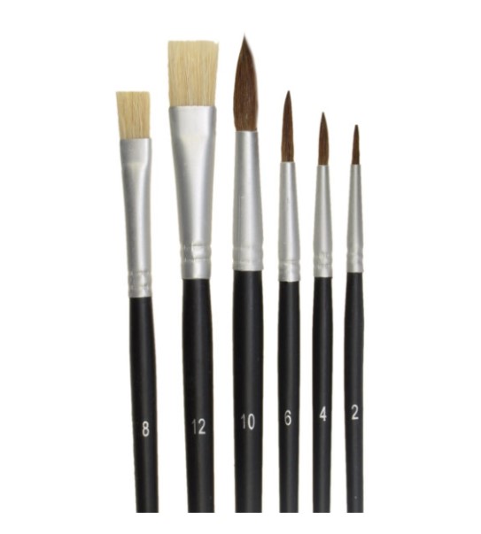 Muoviseen ripustuskoteloon pakattu mustavartinen sivellinsetti sisältää pyöreät poninkarvasiveltimet (vesiväri-) koossa 2,4,6,10 sekä tasakärkiset siankarvasiveltimet koossa 8 ja 12. (TE5)