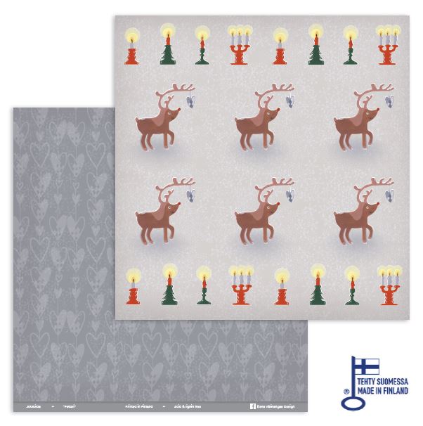 Kotimaiset Jouluiloa -sarjan skräppipaperit ovat Eeva Välikangas-Yli-Kosken käsialaa ja koska ne on myös painettu Suomessa, ovat ne ylpeydeksemme Avainlippu-tuotteita. Paperit ovat kaksipuolista ja mattapintaista 250g kartonkia. Paperit toimitetaan taivutettuna, mutta ei taitettuna. (TE15)