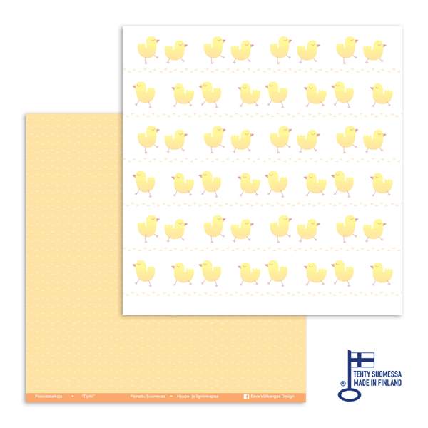 Kotimaiset Pääsiäistaikoja-sarjan skräppipaperit ovat Eeva Välikangas-Yli-Kosken käsialaa ja koska ne on myös painettu Suomessa, ovat ne ylpeydeksemme Avainlippu-tuotteita. Paperit ovat kaksipuolista ja mattapintaista 250g kartonkia. Paperit toimitetaan taivutettuna, mutta ei taitettuna. (TE10)