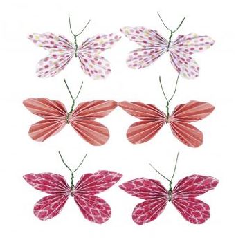 Keväiset värikkäät paperiperhoset sopivat somisteiksi monenlaisiin askarteluihin. Perhoset kiinnitetään takana olevilla kahdella tarratyynyllä. Perhosen koko on 5 x 3 cm. (TE5)