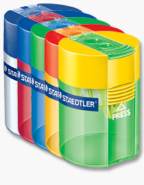 Staedtler säiliöterotin, jossa terotin sekä normaalipaksuisille että jumbo-kynille. Värivalikoima vaihtelee ja verkkokaupasta tilattaessa toimitamme satunnaisen iloisen värin. (TE4 / Täysi pakkaus 10)