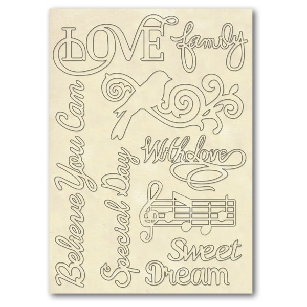 A5-kokoinen vaneriarkki, josta on leikattu valmiiksi irti koristekuvioita, jotka sopivat monenlaisiin projekteihin, mm. tauluihin, mixed mediaan, rasioihin, kortteihin jne. (TE3)